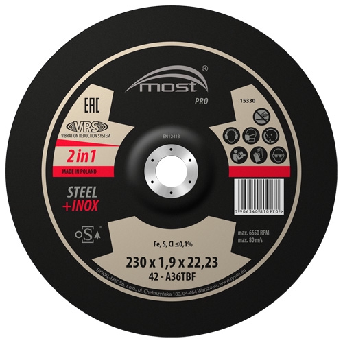 \n\nGrinding discs with increased hardness and durability made from modified corundum grains. Used in demanding grinding operations in harsh industrial conditions. Ultra-thin discs for cutting regular and stainless steel – MOST PRO STEEL + INOX VRS. Universal characteristics suitable for cutting pipes, profiles, and thin and thick-walled sheets. The convex type 42 version provides increased disc stiffness and reduces harmful vibrations generated during cutting (VRS - Vibration Reduction System). They do not contain iron-sulfur compounds (Fe + S + CL \n\n