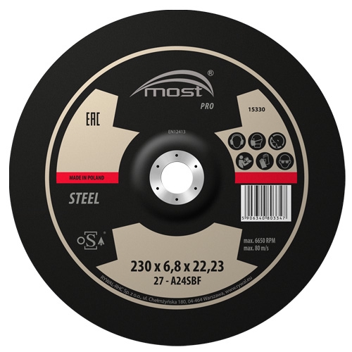 \n\nGrinding discs for regular steel – MOST PRO METAL. Hardened discs for cutting and grinding regular steels. High cutting and grinding aggressiveness and very long lifespan. Grinding discs have increased thickness and additional reinforcing mesh. Maximum peripheral speed 80 m/s. Safety certificates: TÜV Rheinland and OSA (Organisation for Safety Abrasive)\n\n
